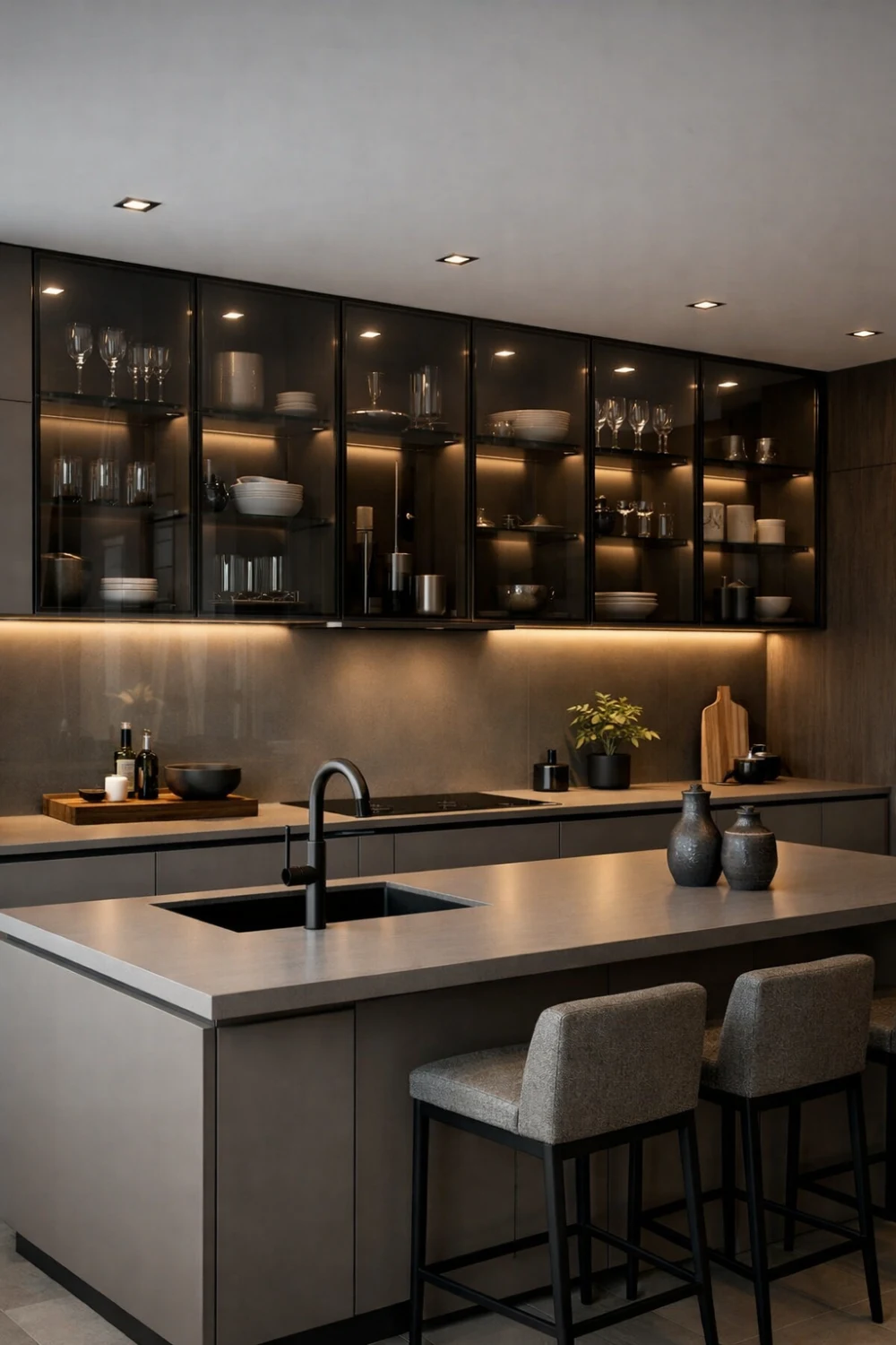 Tinted glass shutters bring a sense of depth and sophistication to kitchen cabinet design. Colors like bronze, grey, or smoked black create a subtle reflective effect that feels luxurious without being overly flashy.